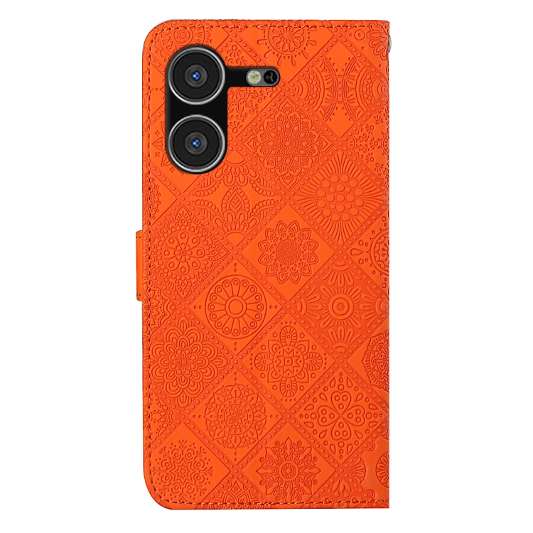 Funda de Cuero para Tecno Pova 5 con Patrón Étnico en Relieve (Naranja)