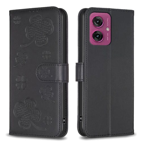 Funda de Cuero con Relieve de Cuatro Hojas para Motorola Moto G55 (Negra)