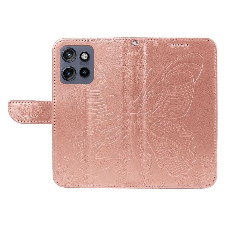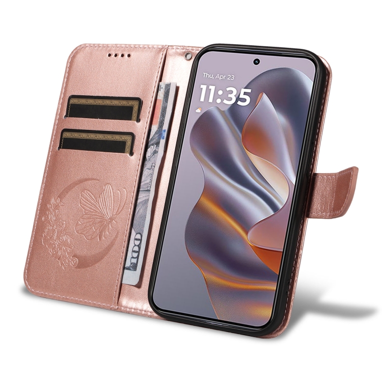 Funda de Cuero con Relieve de Mariposa para Motorola Edge 50 Neo (Oro Rosa)