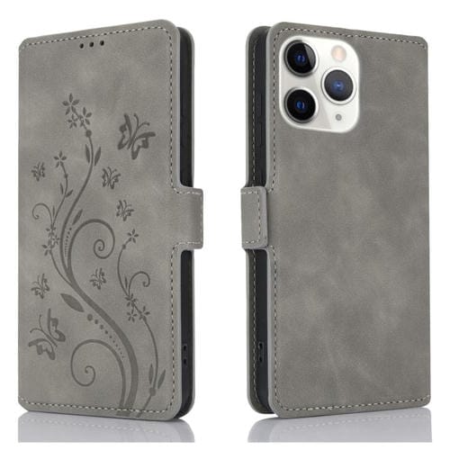 Funda de Cuero para iPhone 11 Pro con Relieve de Mariposa y Flor de Amor (Gris)