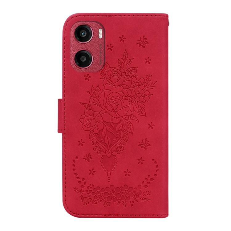 Funda de Cuero Motorola Moto G05/E15 con Relieve Mariposa y Rosa (Rojo)