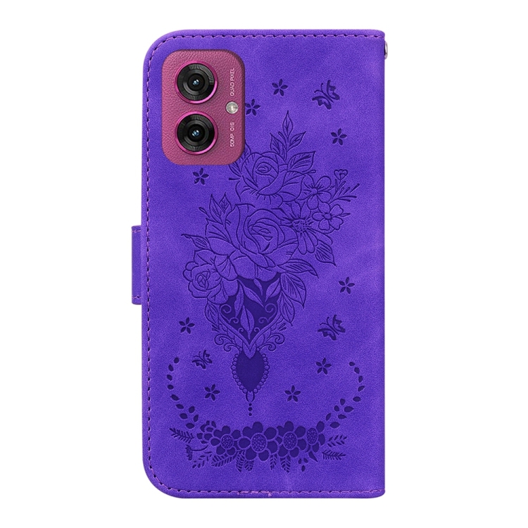 Funda de Cuero con Relieve Mariposa y Rosa para Motorola Moto G55 (Morado)