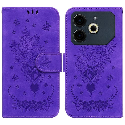 Funda de Cuero para Tecno Pova 6 Neo con Relieve Mariposa y Rosa (Morado)