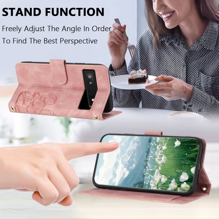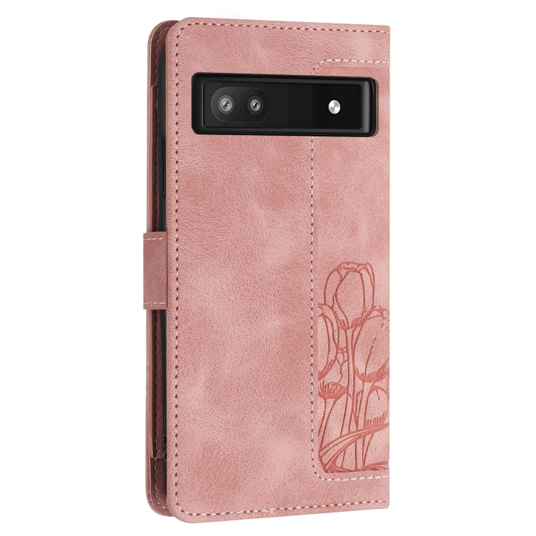 Funda de Cuero con Relieve de Tulipanes para Google Pixel 7A con Cordón (Rosa)