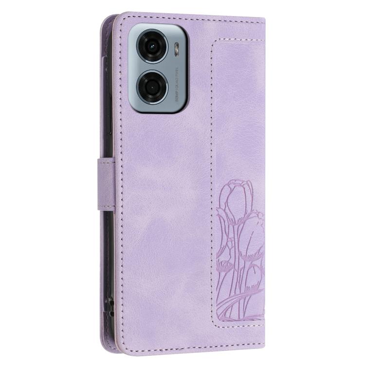 Funda de Cuero con Relieve de Tulipanes para Motorola Moto G05 con Cordón (Morado)