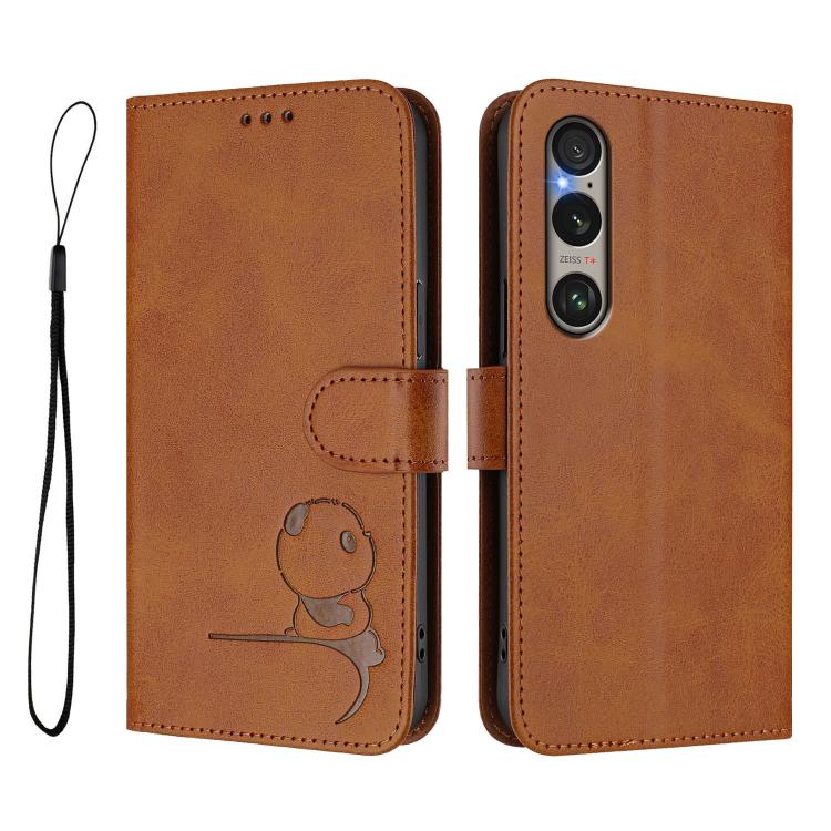 Funda de cuero con relieve RFID y cordón para Sony Xperia 1 VI (marrón)