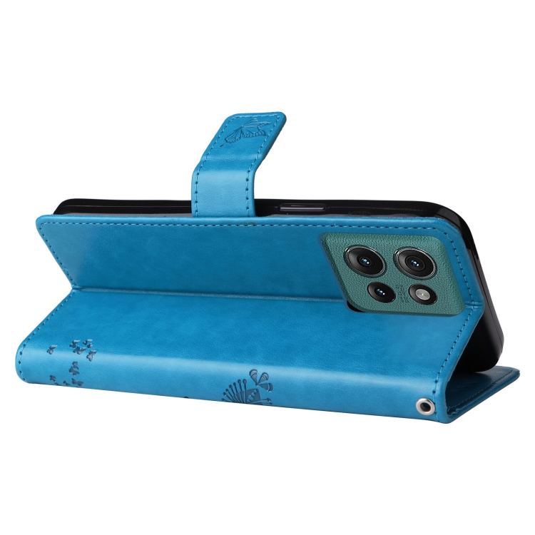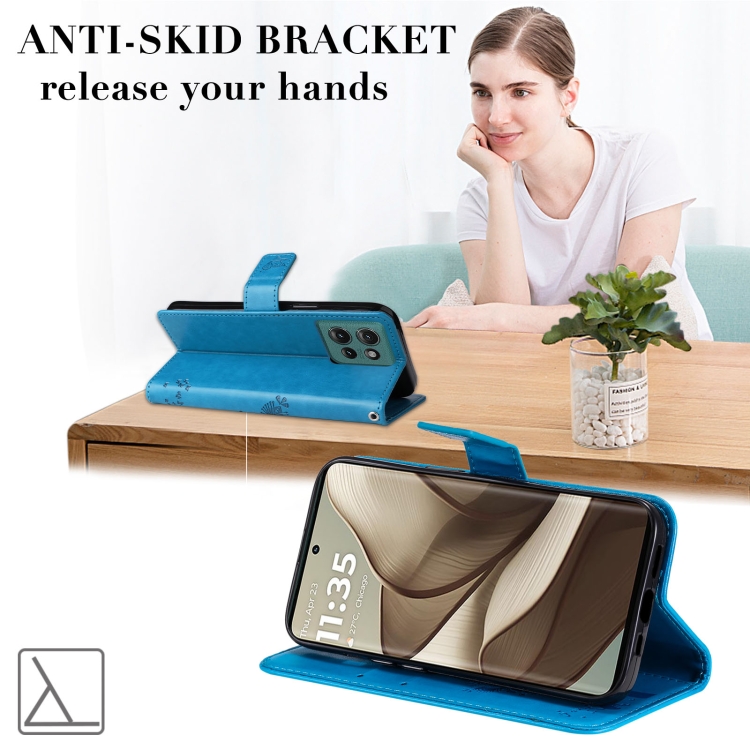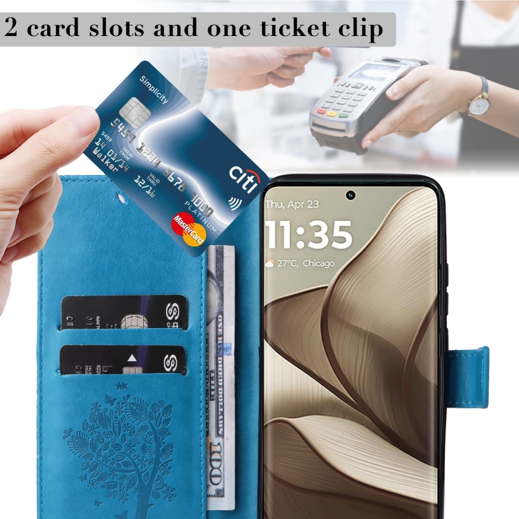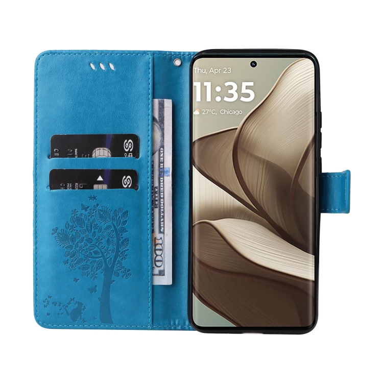 Funda de Cuero con Tapa para Motorola Edge 50 5G con Diseño Árbol y Gato en Relieve (Azul)