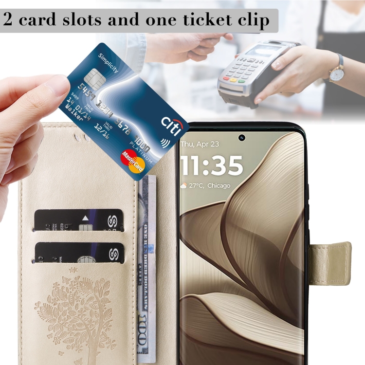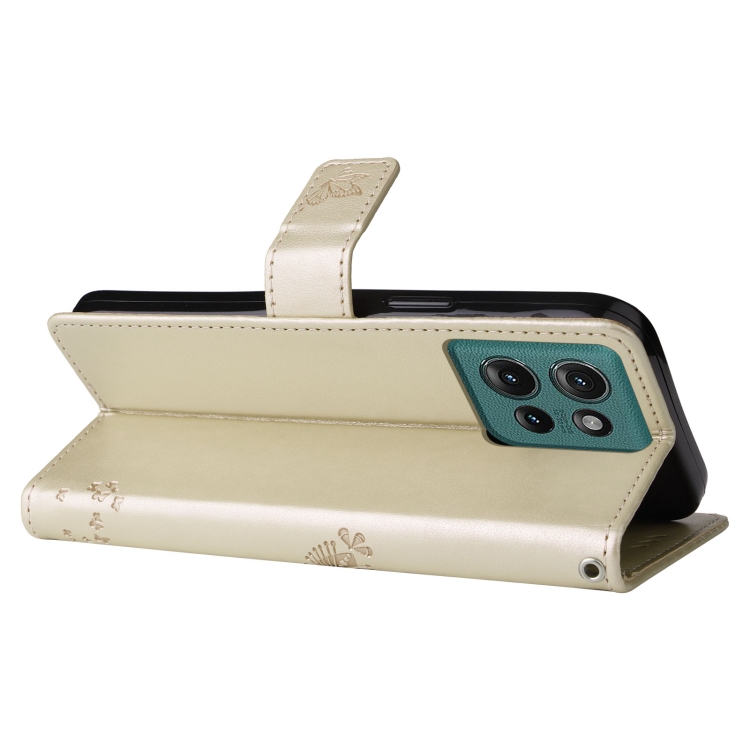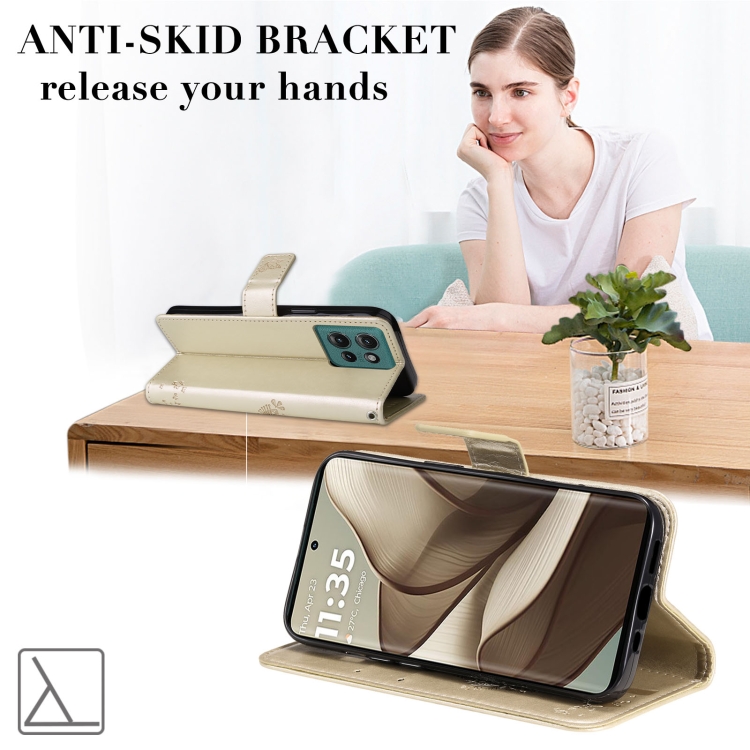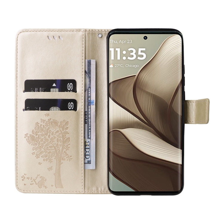 Funda de Cuero con Tapa Motorola Edge 50 5G Diseño Árbol y Gato En Relieve (Dorada)