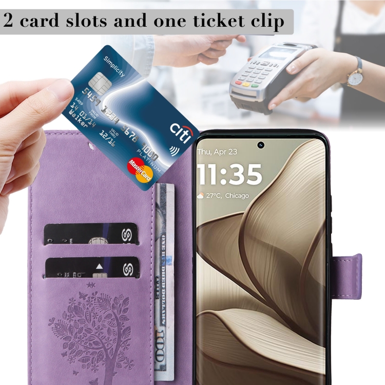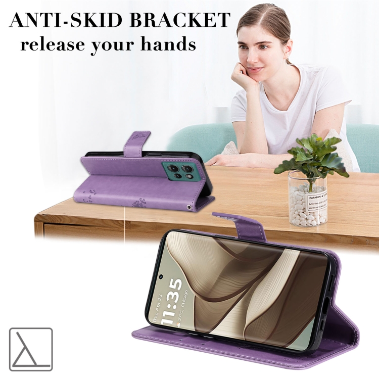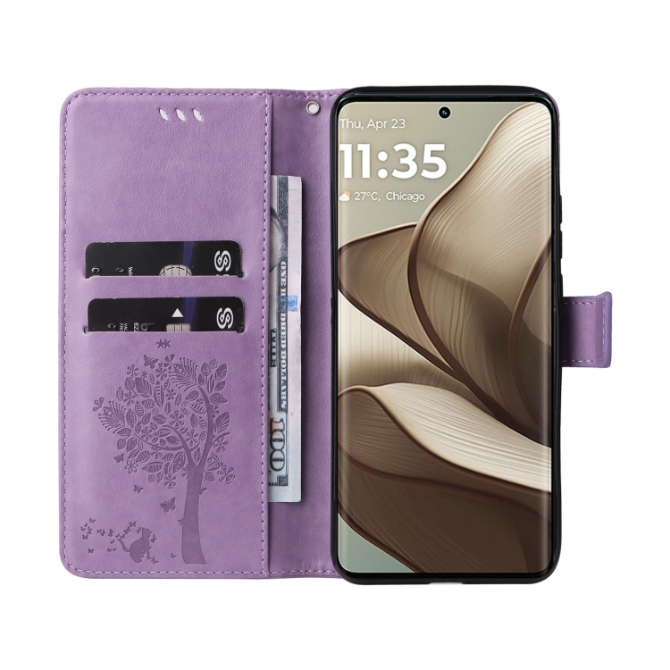 Funda de Cuero con Tapa para Motorola Edge 50 5G con Diseño Árbol y Gato en Relieve (Morado Claro)