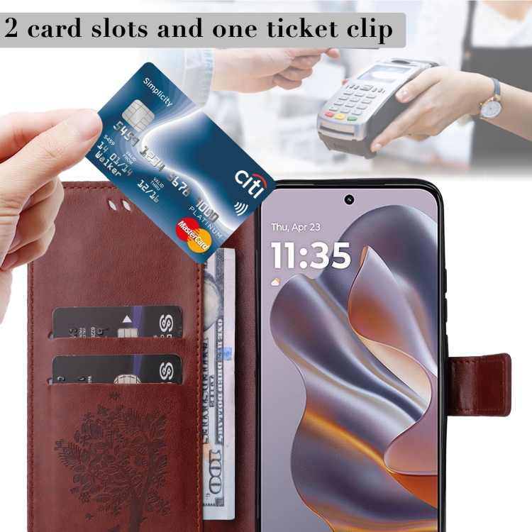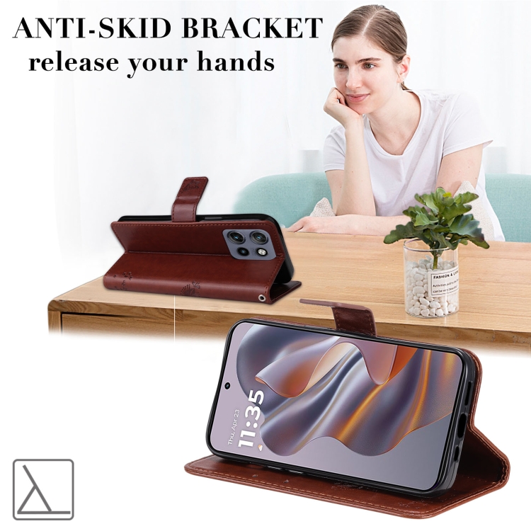 Funda de Cuero con Tapa para Motorola Edge 50 Neo con Diseño de Árbol y Gato en Relieve (Café)