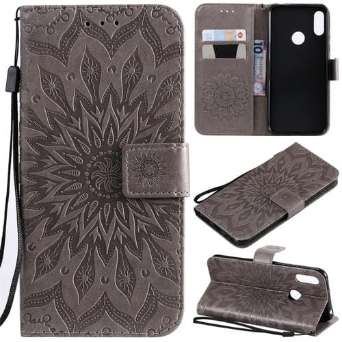 Funda de Cuero con Tapa Horizontal Estampado Sol para Huawei Honor Play 8A Y6 (2019) con Ranura Tarjeta Soporte Billetera Cordón (Gris)