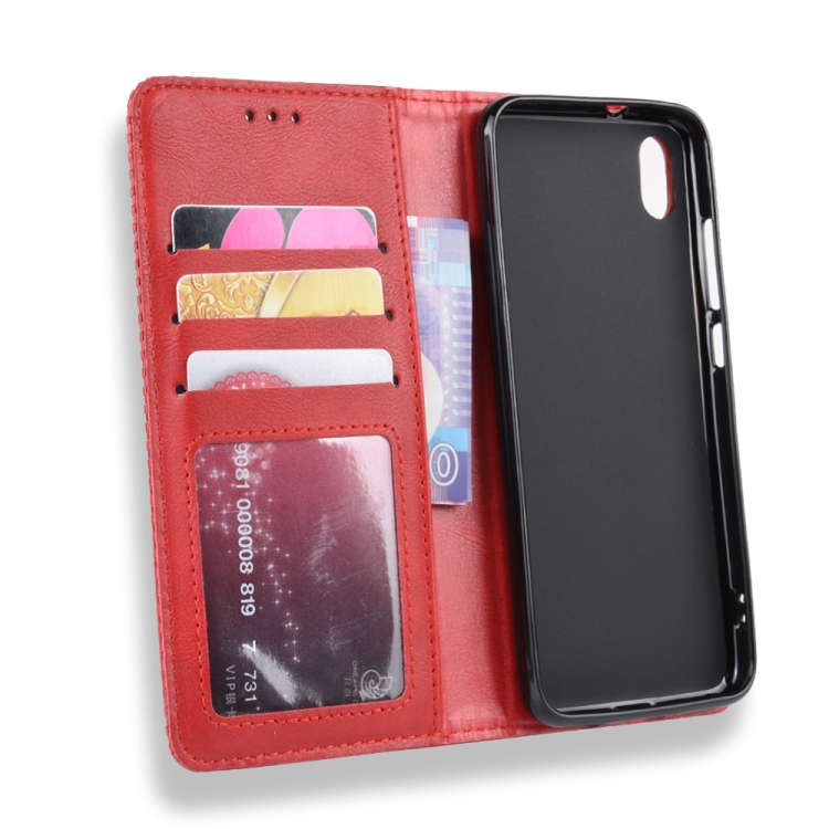 Funda de Cuero con Tapa Horizontal con Textura de Caballo Loco Retro con Hebilla Magnética para Xiaomi Redmi 7A, con Soporte, Ranuras para Tarjetas y Marco de Fotos (Rojo)