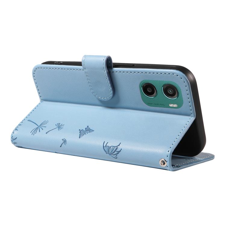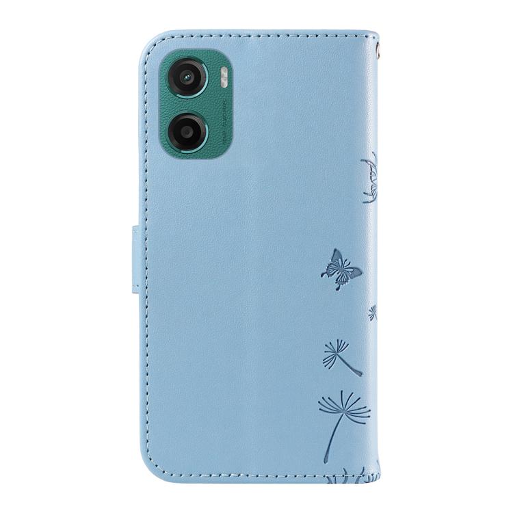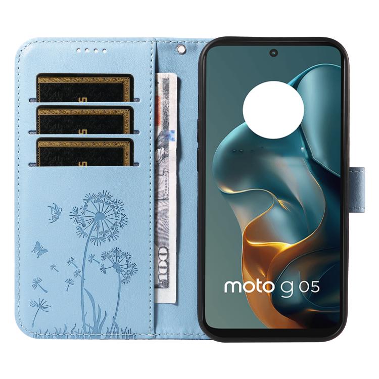 Funda de Cuero con Tapa para Motorola Moto G05 con Diseño de Diente de León en Relieve (Azul Cielo)
