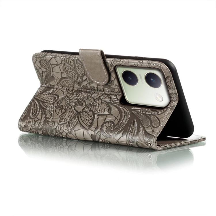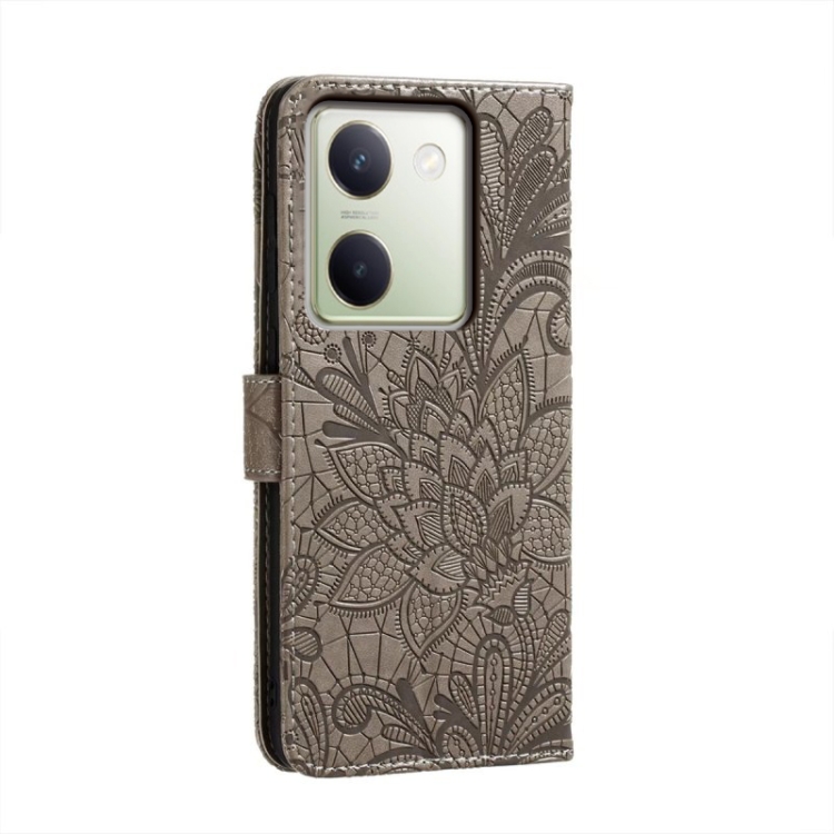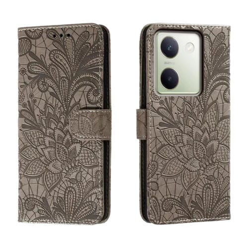 Funda de Cuero con Tapa y Diseño de Flores con Encaje para Vivo Y100 5G (Gris)