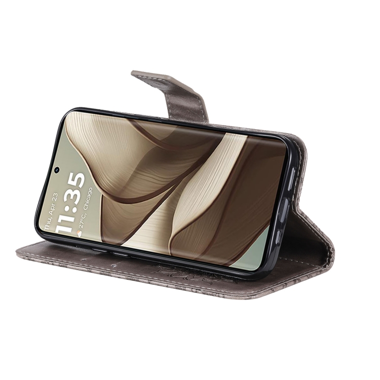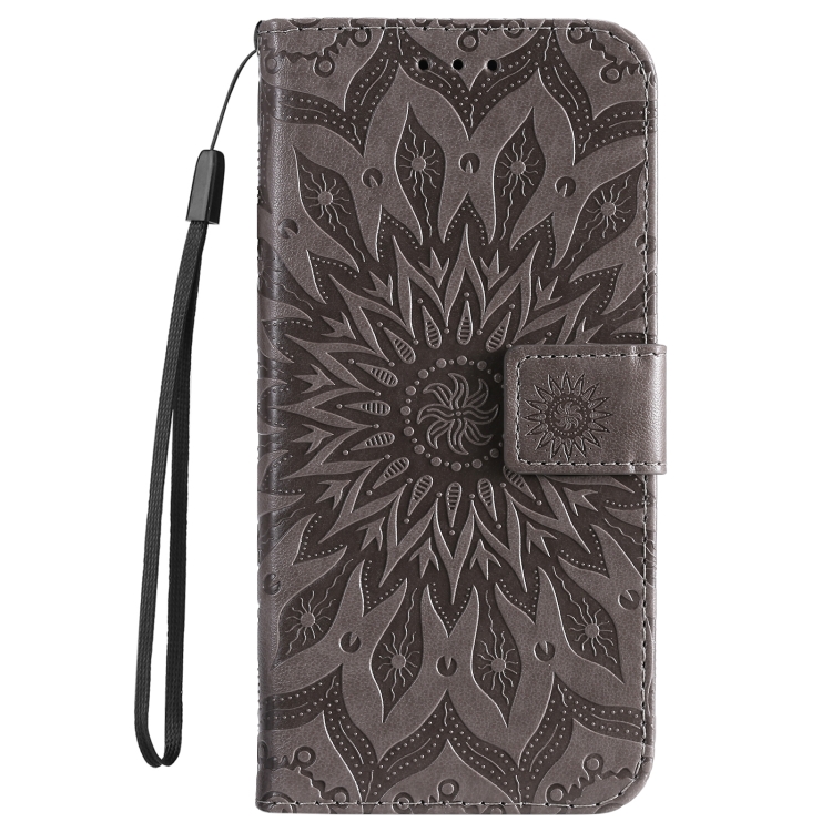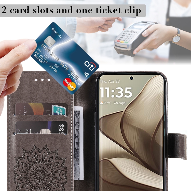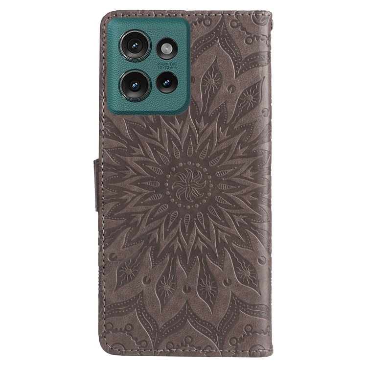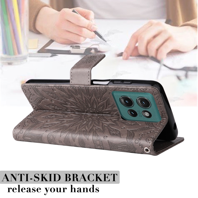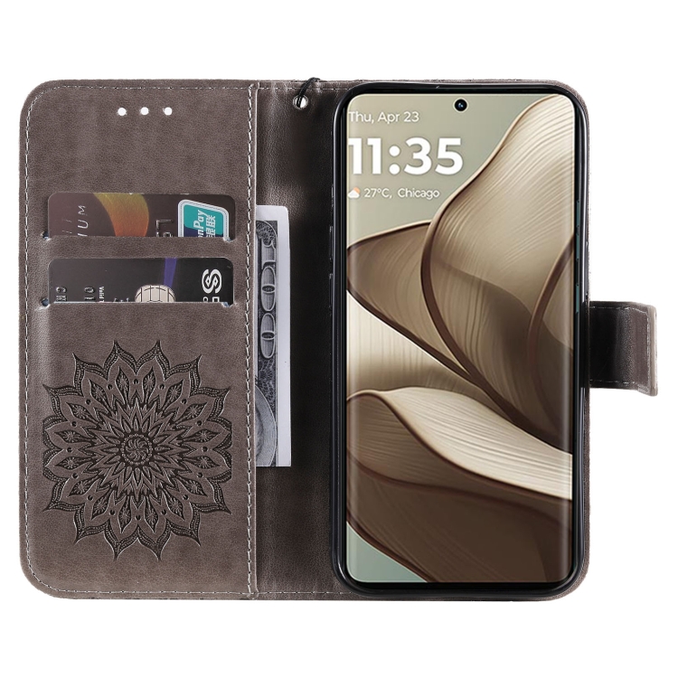 Funda de Cuero con Tapa y Girasol en Relieve para Motorola Edge 50 5G (Gris)