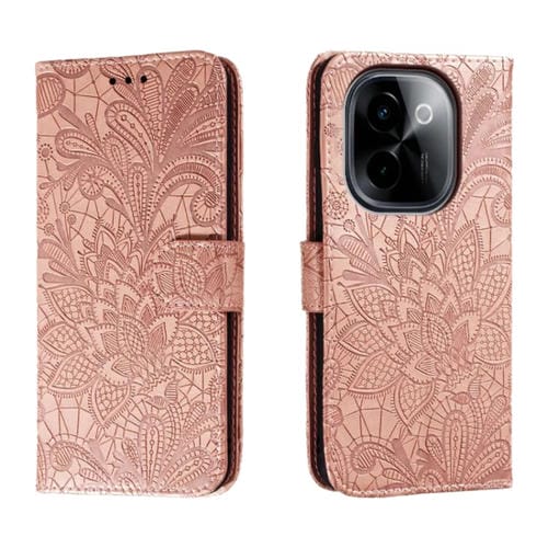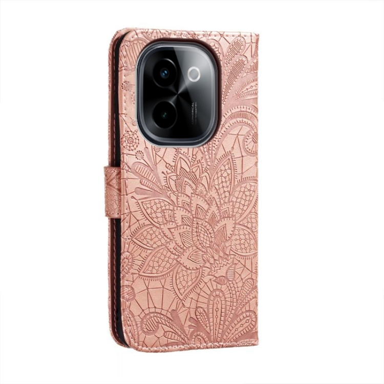 Funda de Cuero con Tapa y Estampado de Flores de Encaje para Vivo Y200 5G (Oro Rosa)
