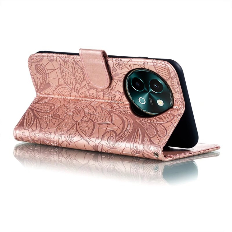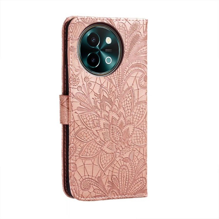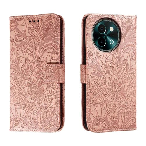 Funda de Cuero con Tapa y Estampado de Flores de Encaje para Vivo Y38 (Oro Rosa)