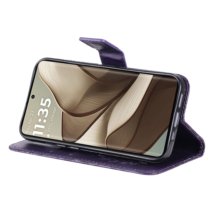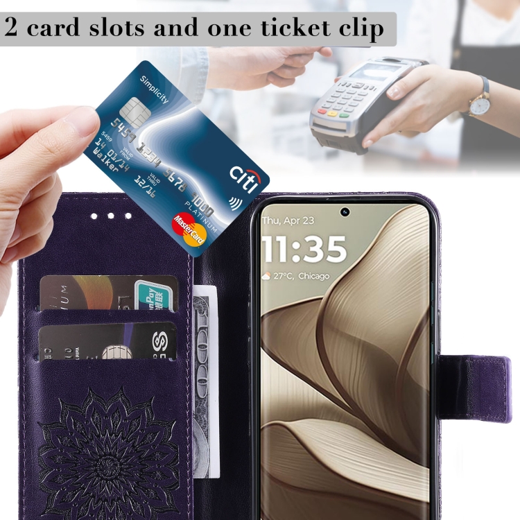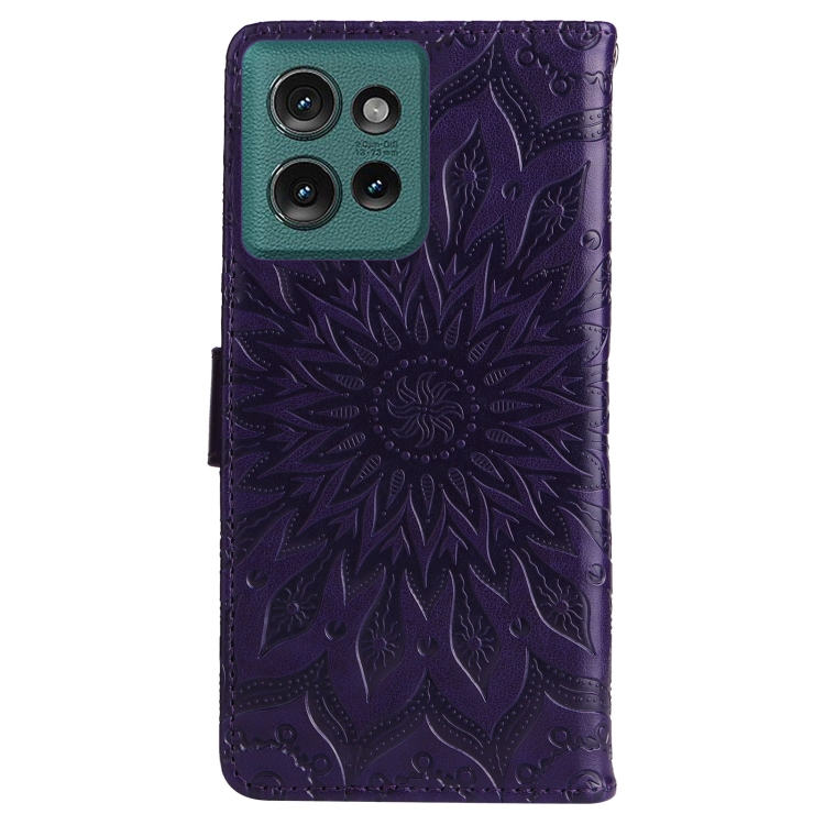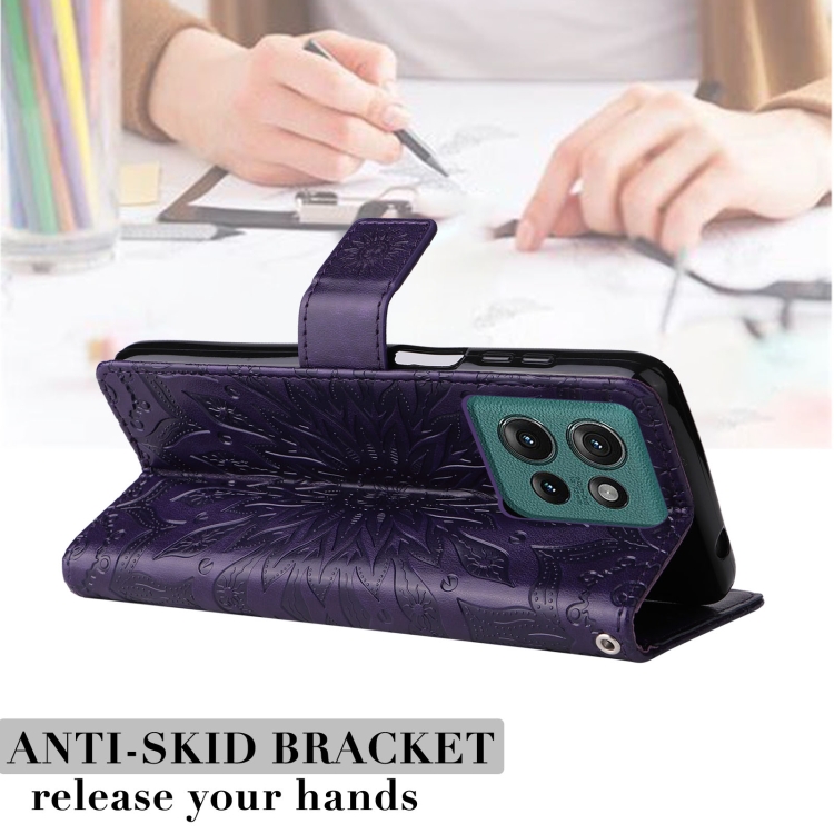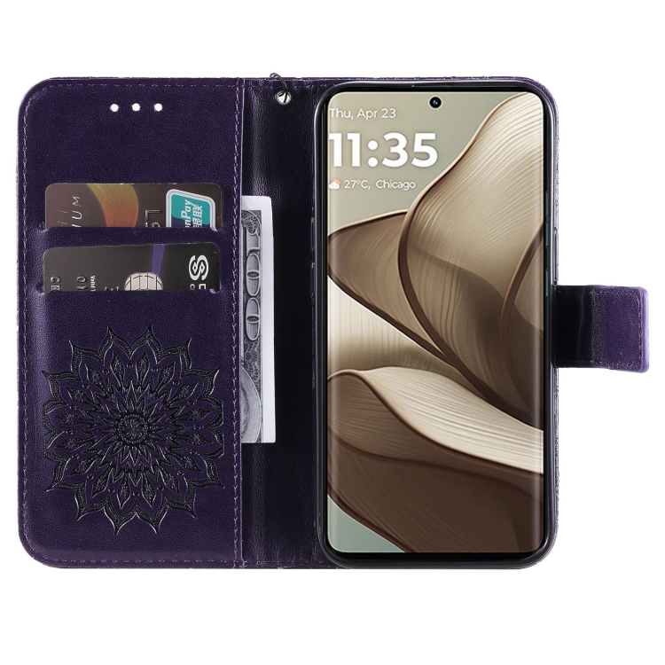 Funda de Cuero con Tapa y Estampado de Girasoles en Relieve para Motorola Edge 50 5G (Morado)