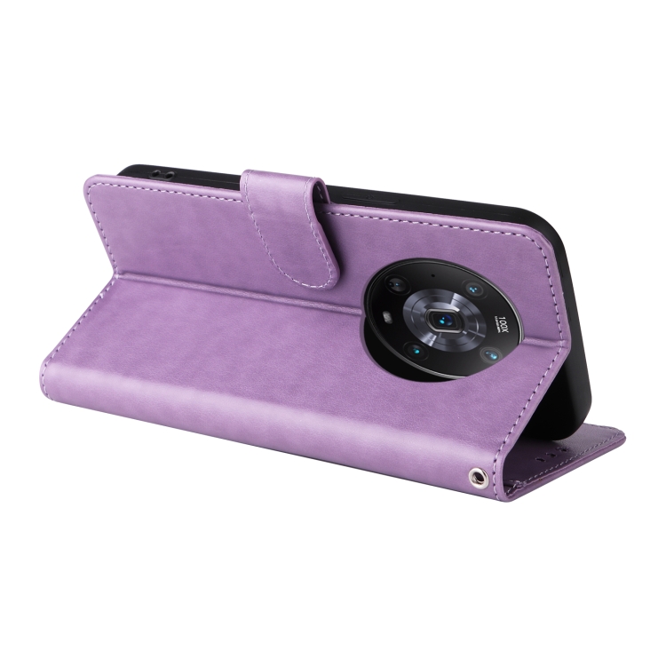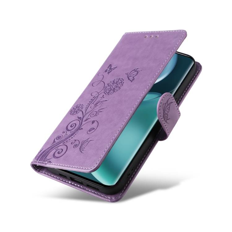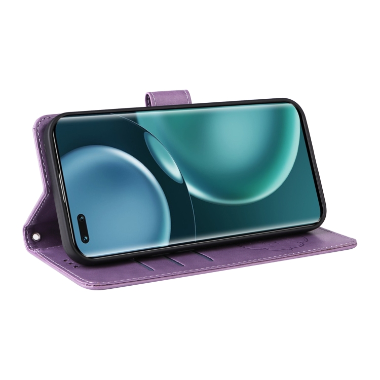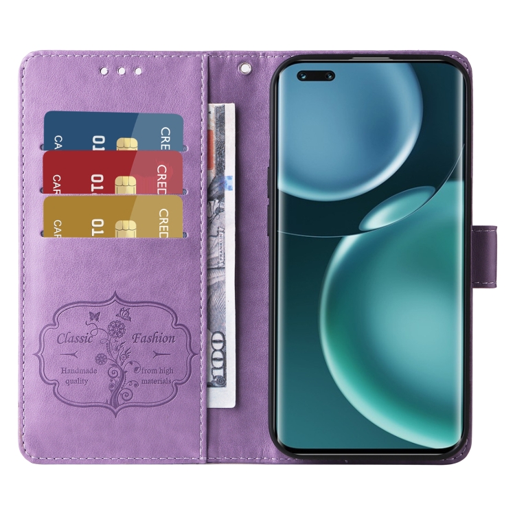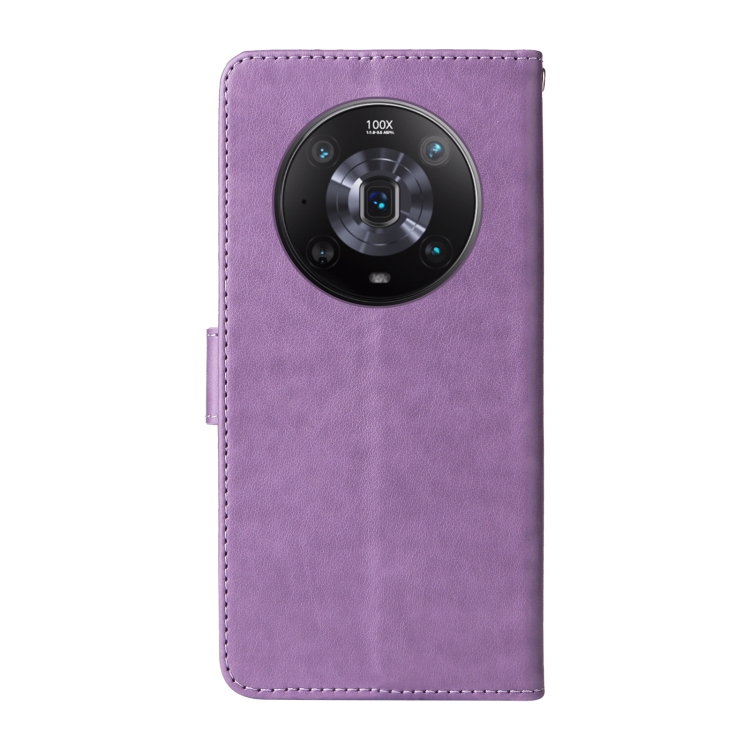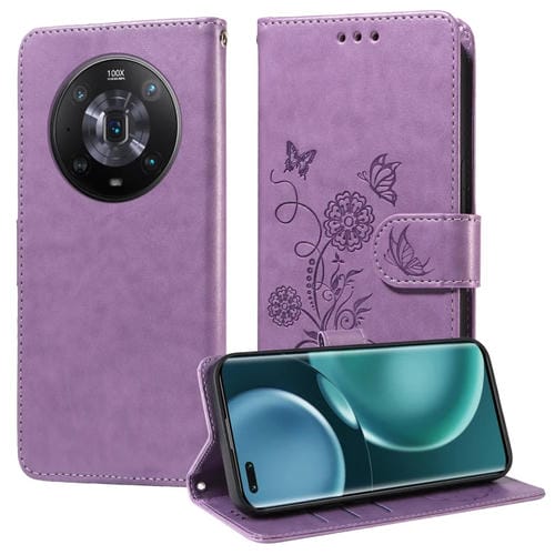 Funda de Cuero para Honor Magic4 con Diseño de Mariposas y Flores en Relieve (Morado)