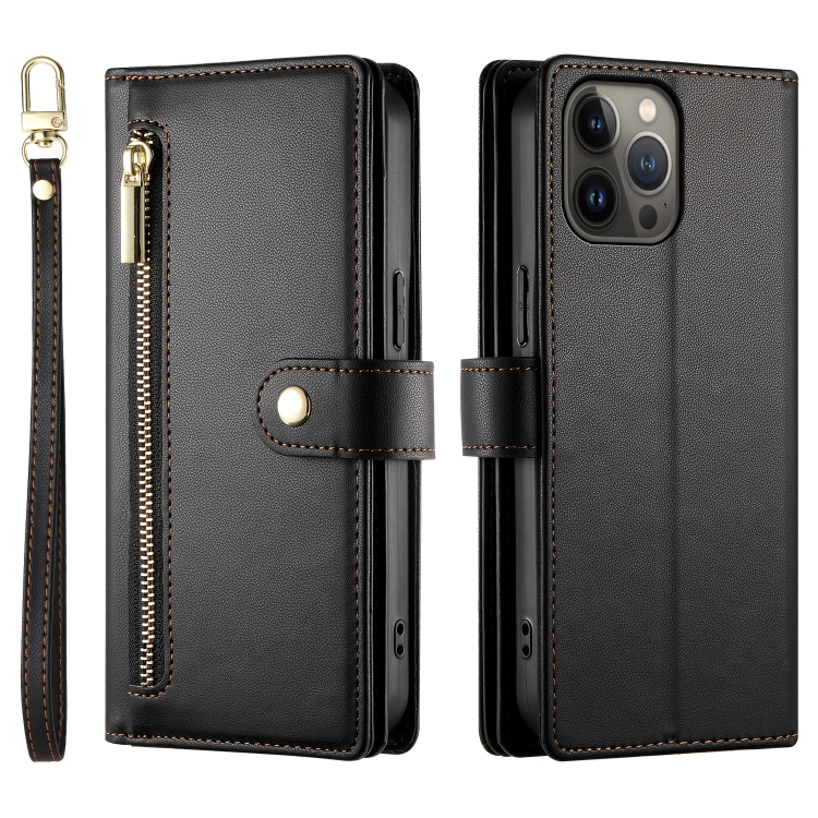 Funda de Cuero para Teléfono iPhone 13 Pro Max con 9 Ranuras para Tarjetas y Cremallera (Negro)