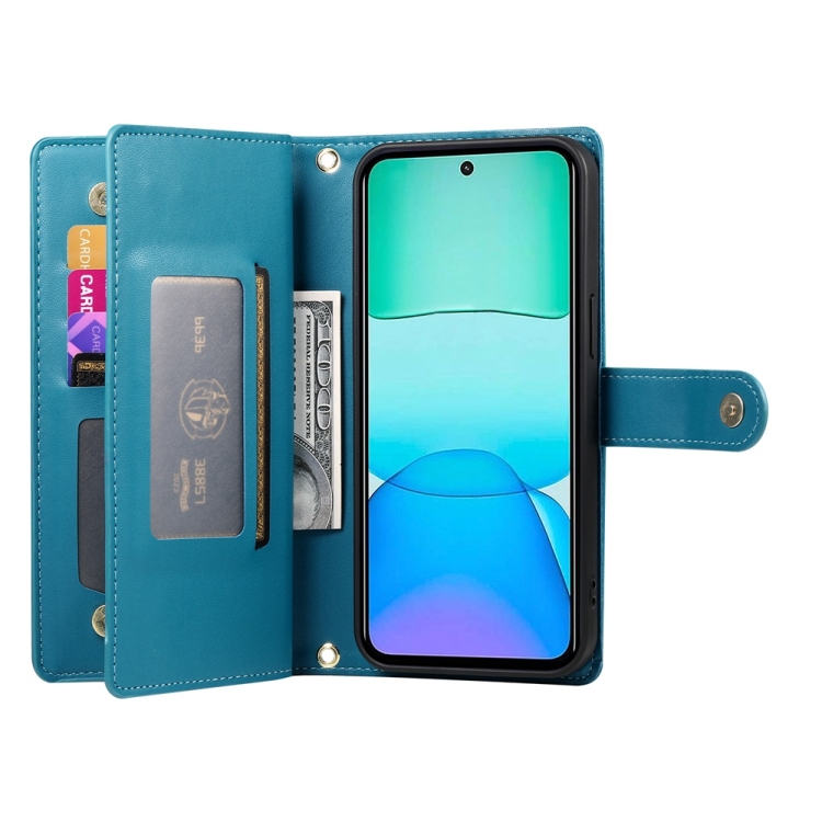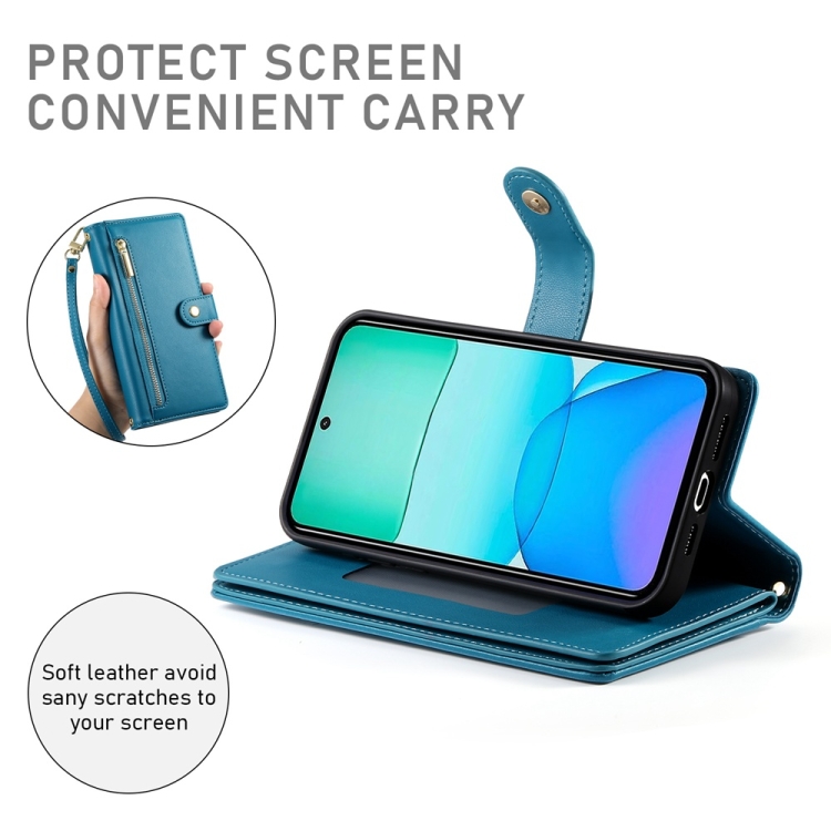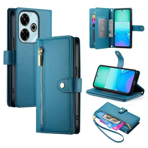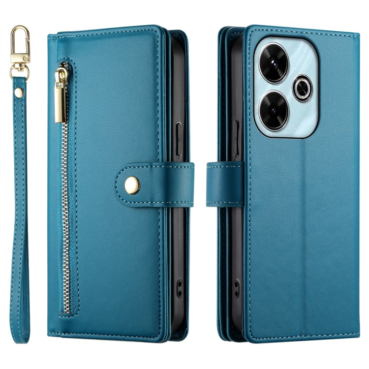 Funda de Cuero para Teléfono Redmi 13 con Nueve Ranuras para Tarjetas y Cremallera (Azul)