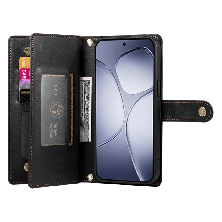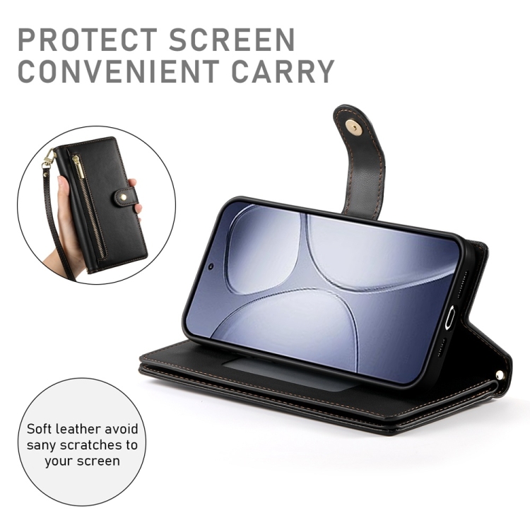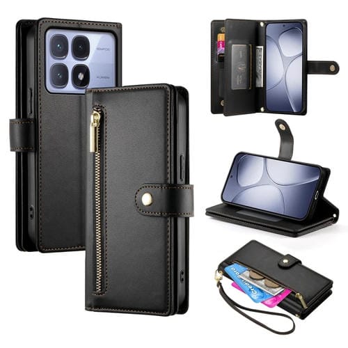 Funda de Cuero para Teléfono Redmi K70 Ultra con Nueve Ranuras para Tarjetas y Cremallera (Negro)