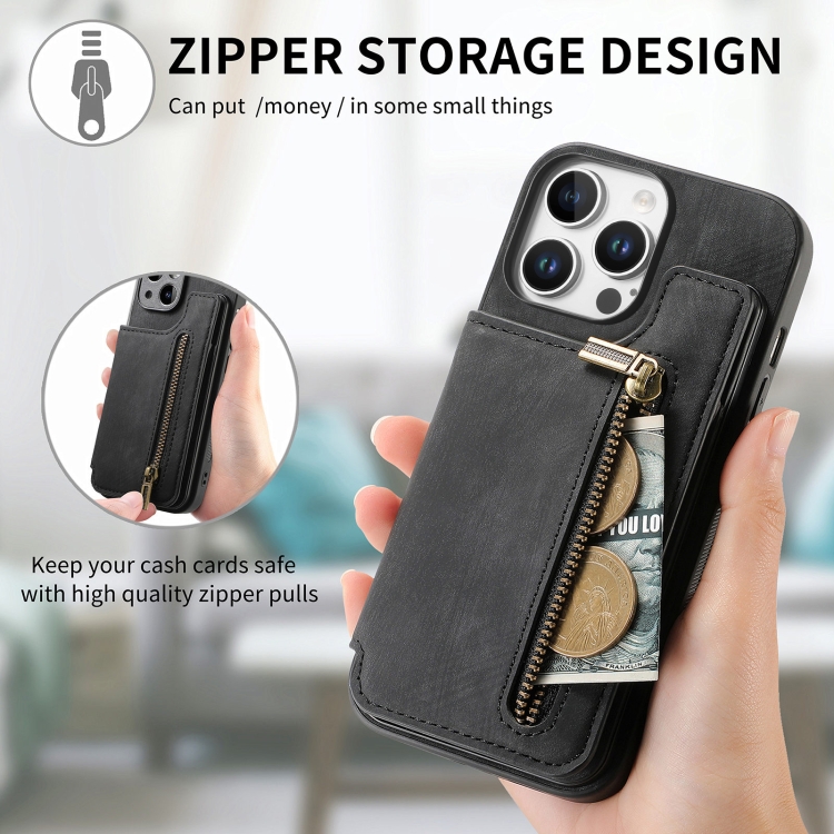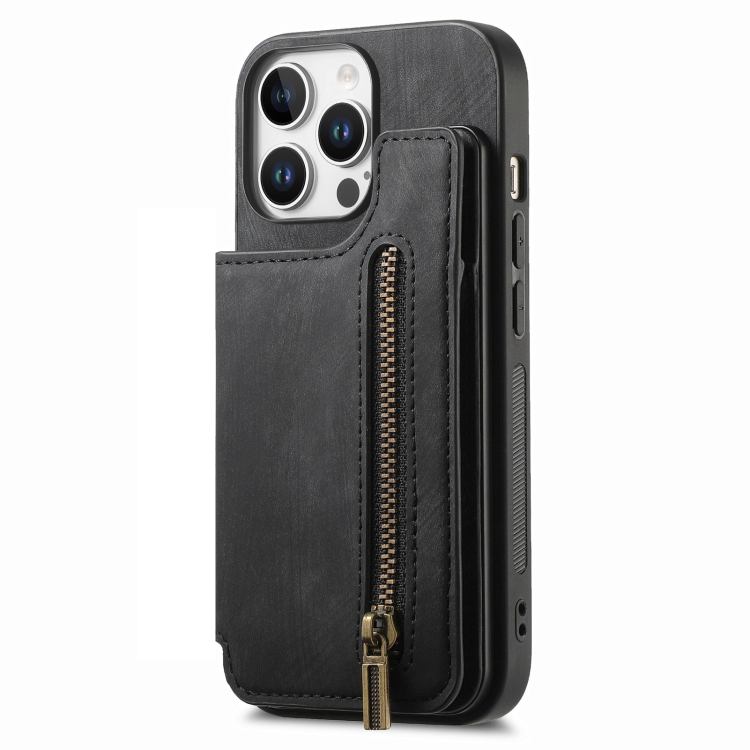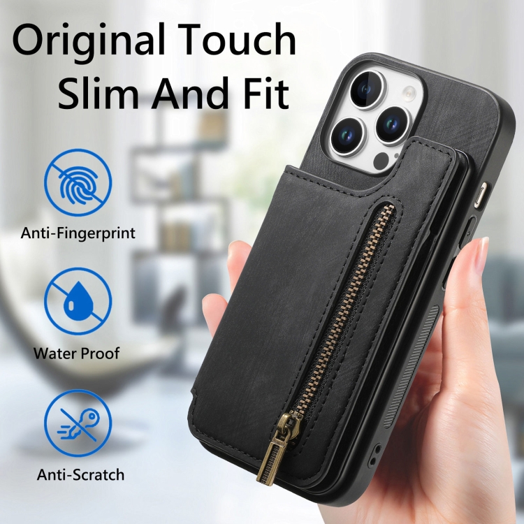 Funda de Cuero Retro con Cremallera y Parte Trasera Tipo Billetera para iPhone 16 Pro (Negra)