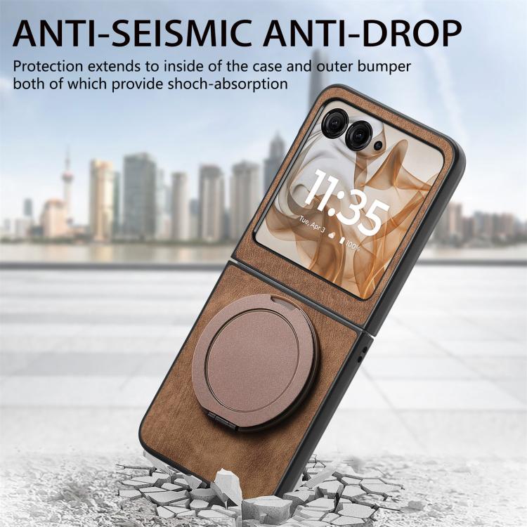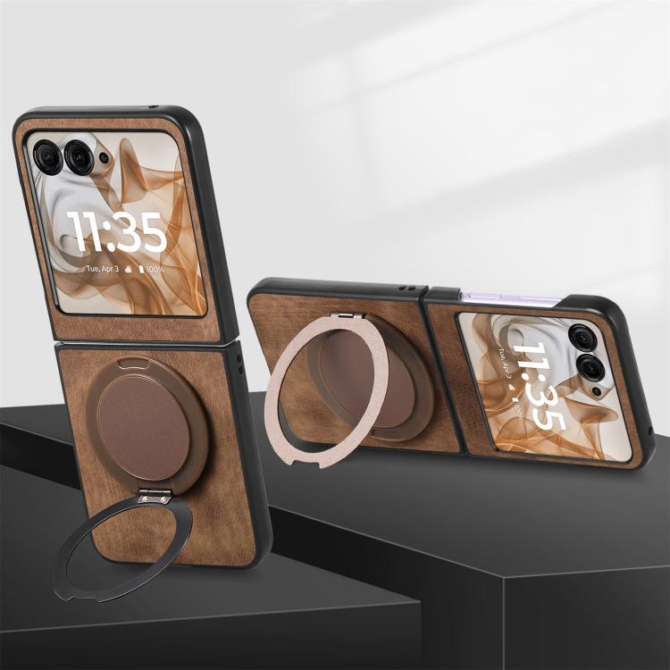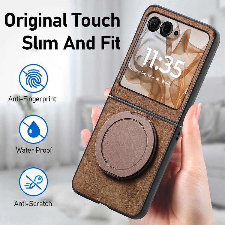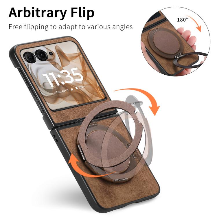 Funda de cuero retro con soporte giratorio redondo para Motorola Moto Razr 50 (marrón)