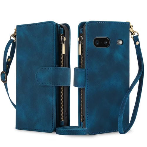 Funda de Cuero Rfid con Cremallera para Google Pixel 7 Dream con 9 Tarjetas y Cordón (Azul)