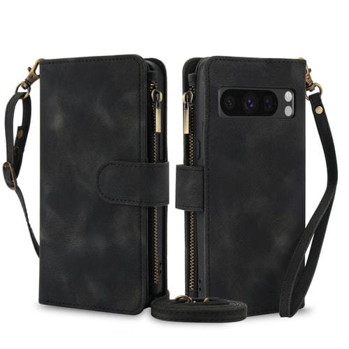 Funda de Cuero Rfid con Cremallera para Google Pixel 8 Pro Dream con 9 Tarjetas y Cordón (Negro)