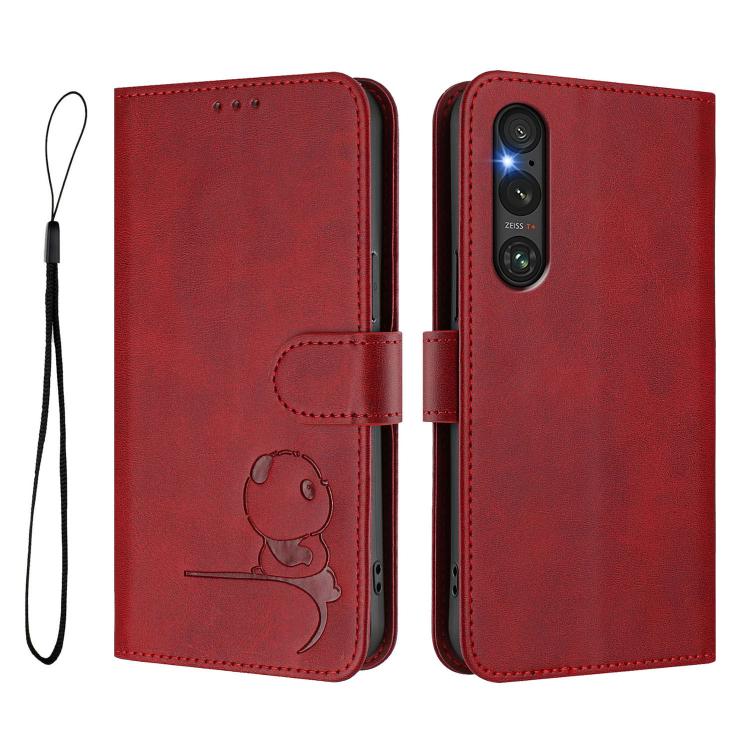 Funda de cuero RFID con estampado de panda y cordón para Sony Xperia 1 V (rojo vino)