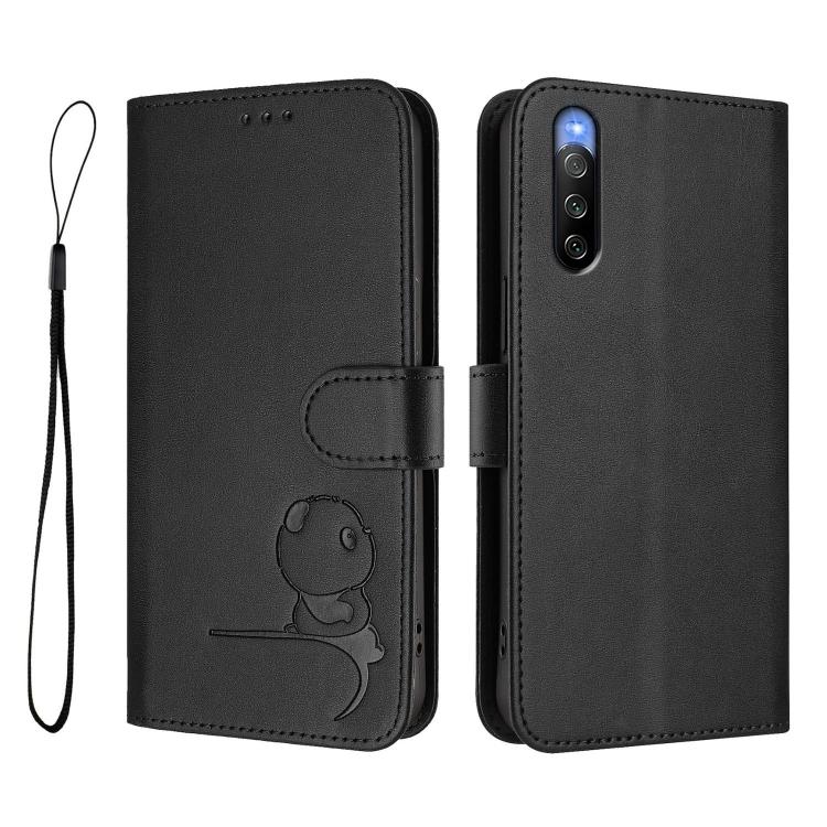 Funda de cuero RFID con estampado de panda y cordón para Sony Xperia 10 V (negra)