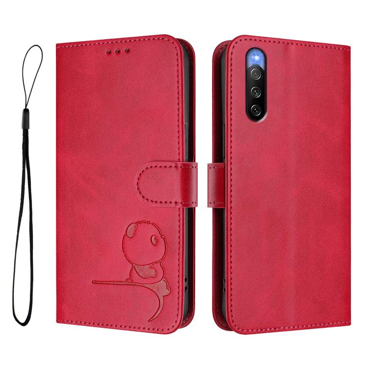 Funda de cuero RFID con estampado de panda y cordón para Sony Xperia 10 V (rosa)