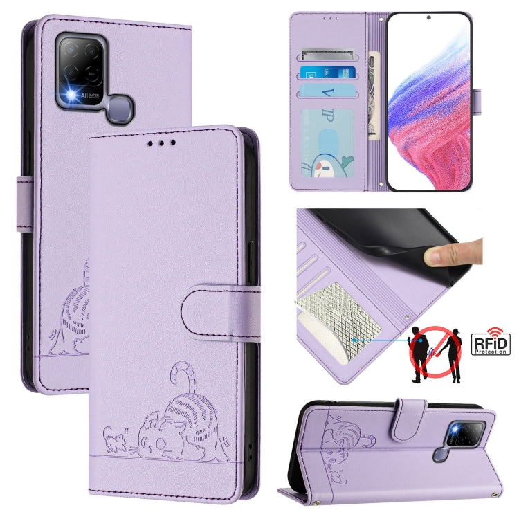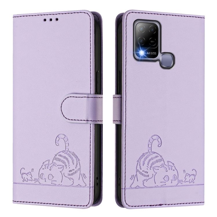 Funda de Cuero RFID para Infinix Hot 10T/10S con Estampado de Rata y Gato en Relieve y Cordón (Morado)