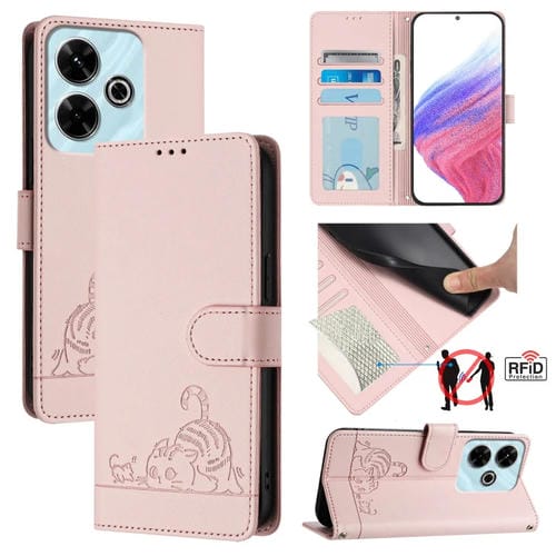 Funda de Cuero Rfid con Estampado de Rata y Gato En Relieve para Redmi 13 4G con Cordón (Rosa)