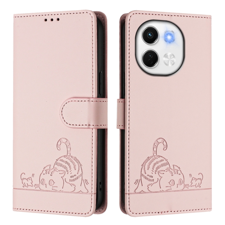 Funda Cuero Rfid Tecno Spark 30 5G Estampado Rata y Gato Relieve con Cordón (Rosa)