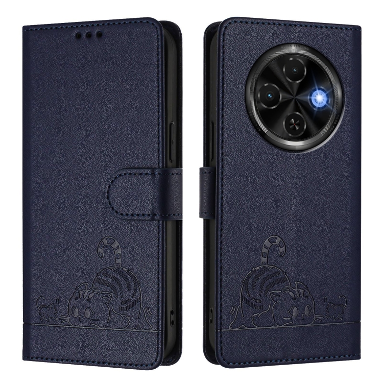 Funda Cuero Rfid Tecno Spark 30C Estampado Rata y Gato En Relieve con Cordón (Azul)