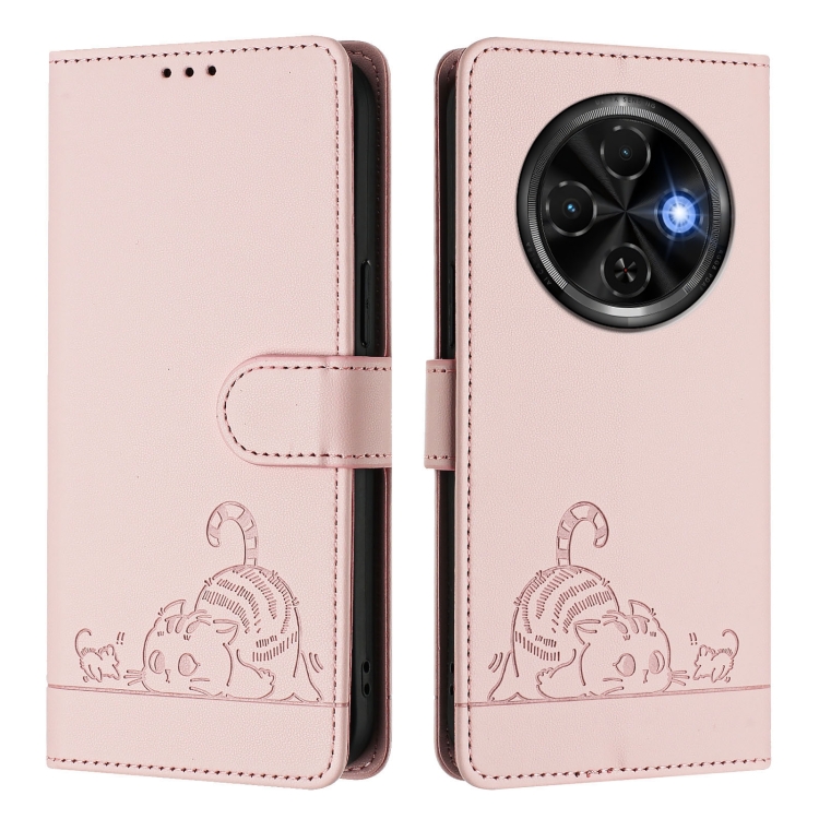 Funda de Cuero Rfid para Tecno Spark 30C con Estampado de Rata y Gato En Relieve y Cordón (Rosa)