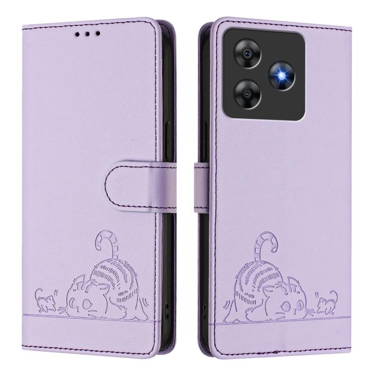 Funda de Cuero Rfid para BlackView Wave 8C con Cordón y Estampado de Rata y Gato (Morado)
