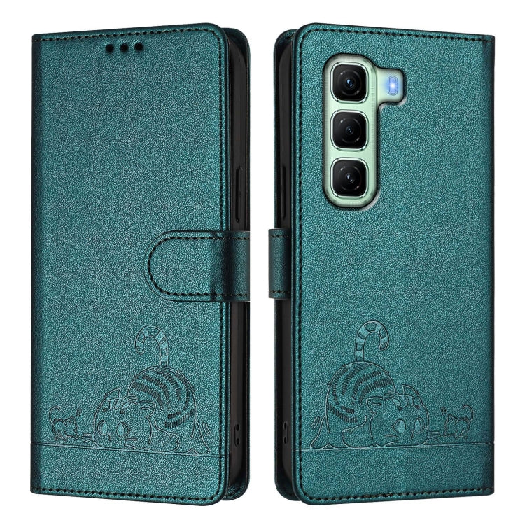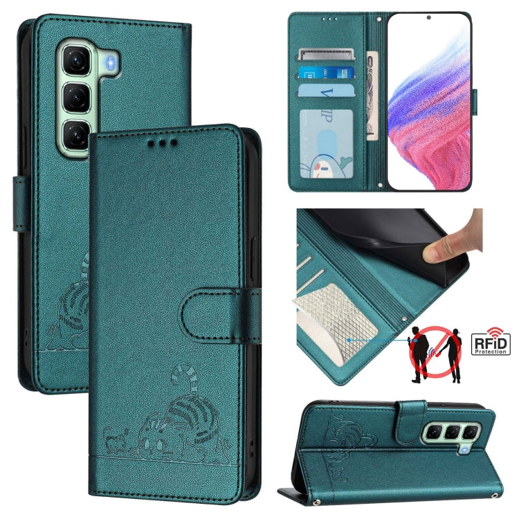 Funda de Cuero Rfid para Infinix Hot 50 5G con Estampado de Rata y Gato y Cordón (Verde Pavo Real)