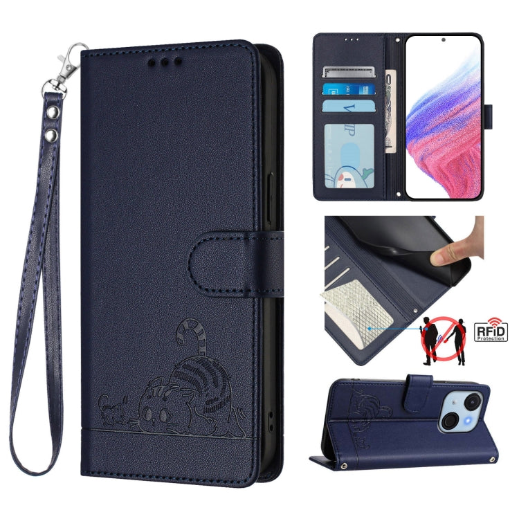 Funda de Cuero Rfid para Teléfono Itel A50C con Estampado de Rata y Gato y Cordón (Azul)