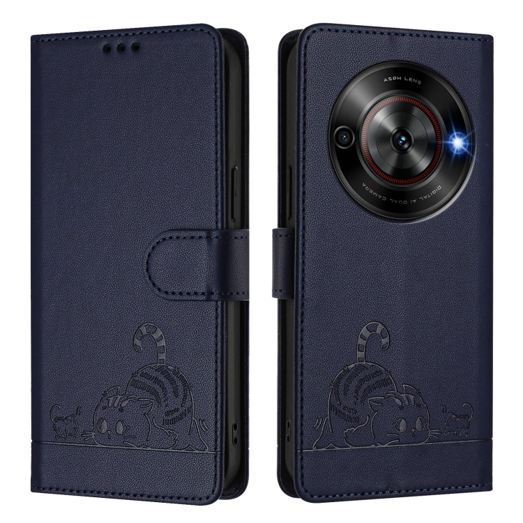 Funda de Cuero Rfid para ZTE Blade A75 5G con Estampado de Rata y Gato y Cordón (Azul)