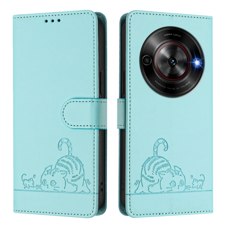 Funda de Cuero Rfid para ZTE Blade A75 5G con Estampado de Rata y Gato y Cordón (Verde Menta)