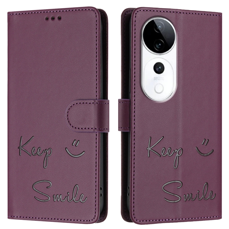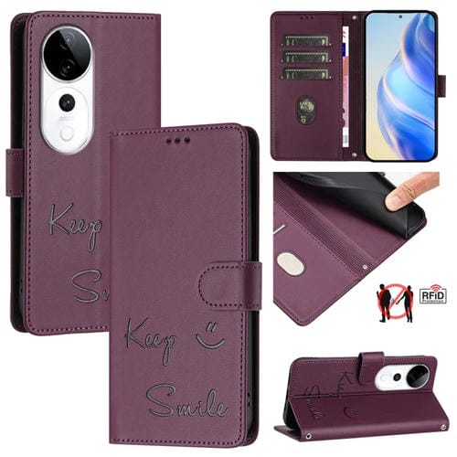 Funda de Cuero Rfid con Relieve de Sonrisa para Teléfono Vivo S19 Pro (Violeta)
