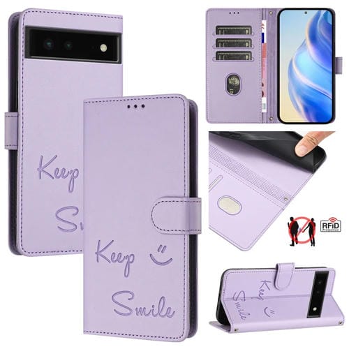 Funda de Cuero Rfid con Relieve Sonriente para Google Pixel 6 (Morado Claro)