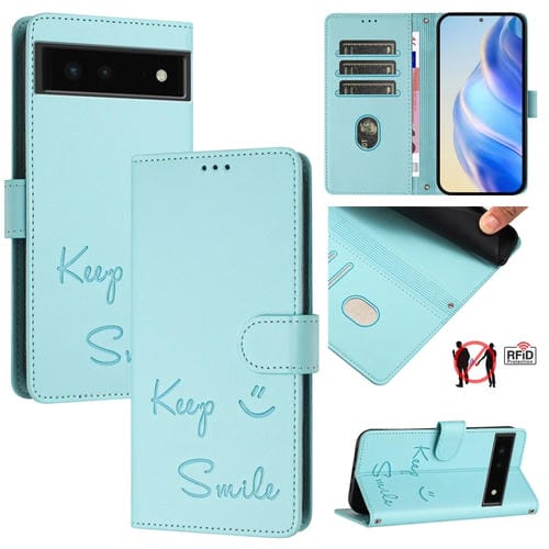 Funda de Cuero Rfid con Relieve Sonriente para Google Pixel 6 (Verde Menta)