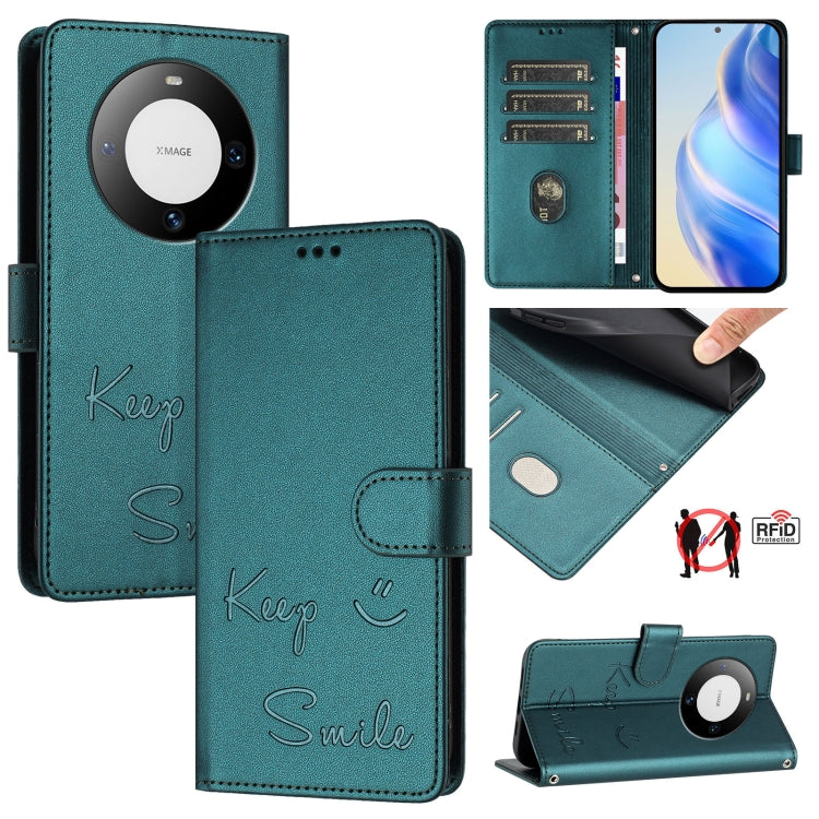Funda de Cuero Rfid con Relieve Sonriente para Huawei Mate 60 Pro/60 Pro+ (Verde Pavo Real)