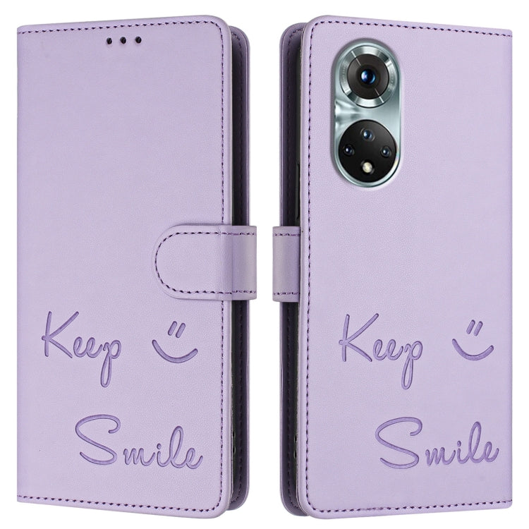 Funda de Cuero Rfid con Relieve Sonriente para Huawei Nova 9 Pro (Morado Claro)