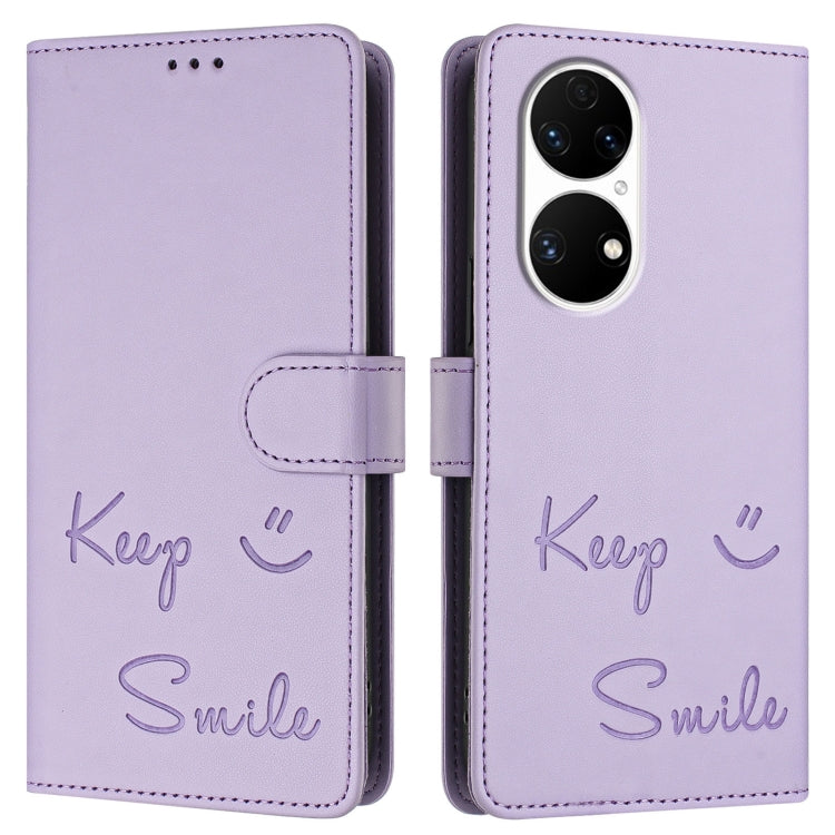Funda de Cuero Rfid para Huawei P50 con Relieve Sonriente (Morado Claro)