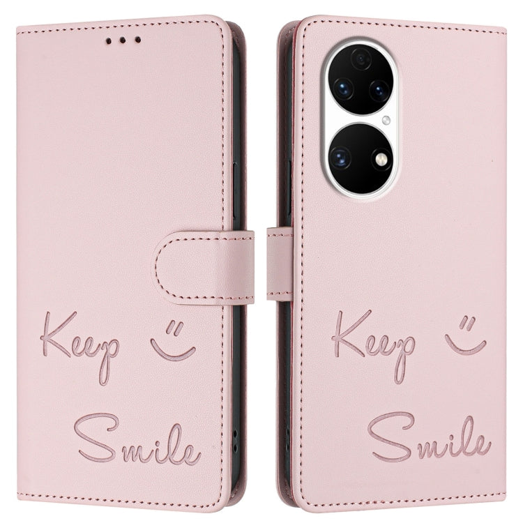 Funda de Cuero Rfid con Relieve Sonriente para Huawei P50 Pro (Rosa)